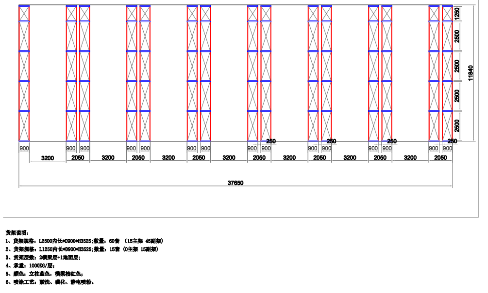 1、貨架規格:L2500*D900*H3525 數量:60套  (15主45副)